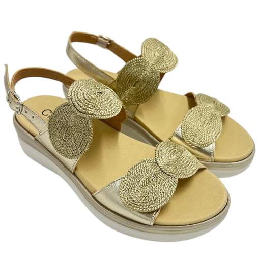 SANDALO IN PELLE E TESSUTO LAMINATO CON DUE FASCE A STRAPPOZEPPA 4 CM - SOTTOPIEDE ESTRAIBILE -