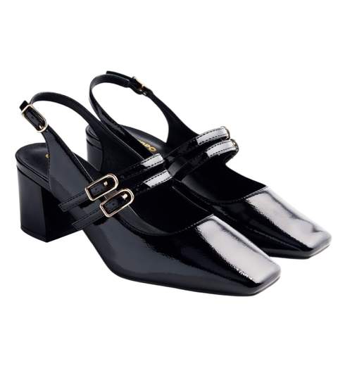 Scarpe con tacco e finitura in vernice. Punta squadrata. Hanno una soletta imbottita, tacco a blocco e chiusure regolabili su collo del piede e tallone. Altezza tacco: 5,5 cm. Tomaia e fodera in poliuretano. Soletta in pelle. Suola in gomma.DETTAGLI PRODOTTO
