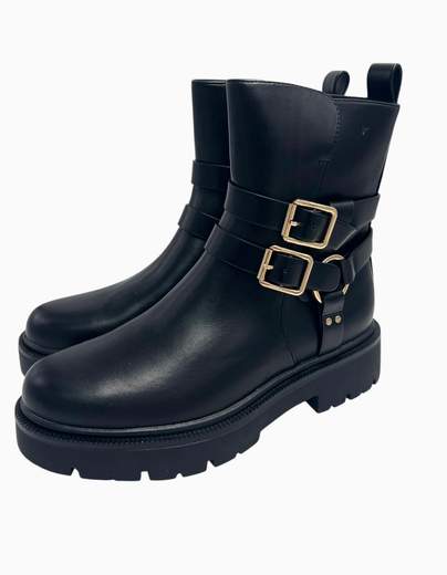 Stivali in pelle stile biker con fibbie dorate, dettaglio staffa e suola track. Al polpaccio e punta arrotondata. Hanno una soletta imbottita e una cerniera sul lato interno del gambale. Altezza gambale: 16 cm. Altezza tacco: 4 cm. Seguiamo la guida standard per la larghezza del gambale, regolando la misura in base alla taglia. La taglia 37 si adatta a polpacci con un perimetro fino a 38 cm. Tomaia in poliuretano. Fodera traspirante in pelle e poliestere. Soletta in pelle. Suola flessibile in TPR.DETTAGLI PRODOTTO