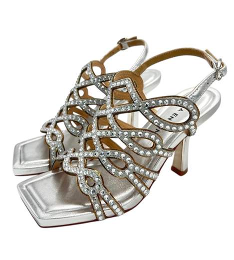 SANDALO FASCIATO IN PELLE LAMINATA CON SWAROSKITACCO ALTO 9 CM CON PLATEAU DI 1,5 CM