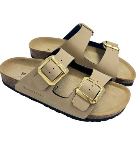 Chiusura regolabile sulla tomaia con due fibbie. Suola interna ergonomica. Tomaia in pelle e fondo in gomma.