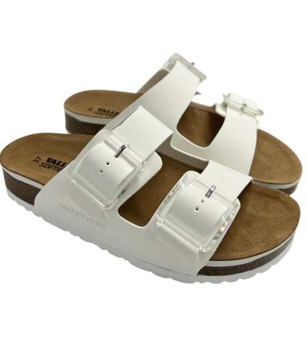 Chiusura regolabile sulla tomaia con due fibbie. Suola interna ergonomica. Tomaia in pelle e fondo in gomma.