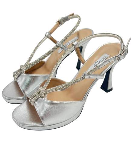 SANDALO IN PELLE LAMINATA CON SWAROSKITACCO ALTO 8,5 CM CON PLATEAU DI 1,5 CM